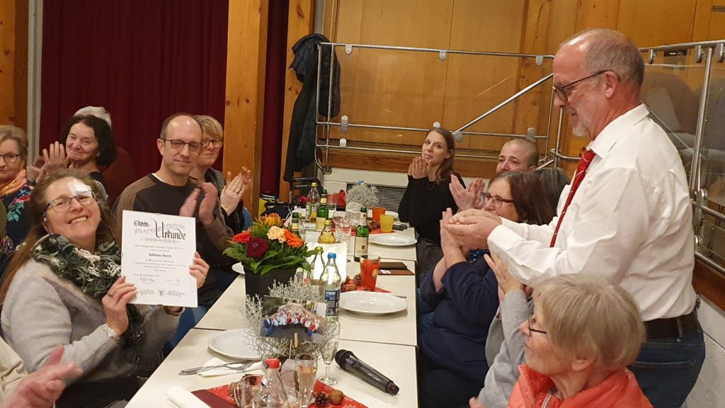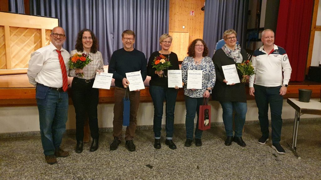 So wurde Sabine Horn für 25 Jahre als förderndes Mitglied und für 25 Jahre aktives Singen Katja Dieterich, Andrea Fuhrmann, Andrea Huppert, Karen Schray und Markus Feucht geehrt.
