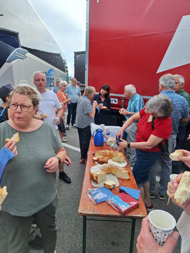 Unterwegs zum Tagesziel gab es für die Mannschaft von, wie nannte es unsere 2. Vorsitzende Daniela Silzle so schön – „Gesangverein-Glücklich-Reisen“ – aber noch eine obligatorische Rast mit heißem Kaffee und Hefezopf.