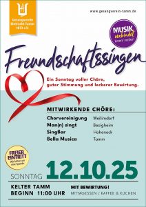 Am Sonntag ist es so weit - Freundschaftssingen am 12. Oktober in der Kelter Tamm Wir versprechen Ihnen einen bunten Mittag mit Programm für die Seele in Form von viel unterhaltsamer Musik und tollem Gesang von 4 verschiedenen Chören, aber auch für den Leib gibt es leckere Bewirtung! Freuen Sie sich auf Maultauschen (auch vegetarisch) oder Schnitzel mit Kartoffelsalat und später noch Kaffee und selbstgebackene Kuchen. Hört sich das gut an?Na, dann freuen wir uns, Sie am Sonntag zu sehen…